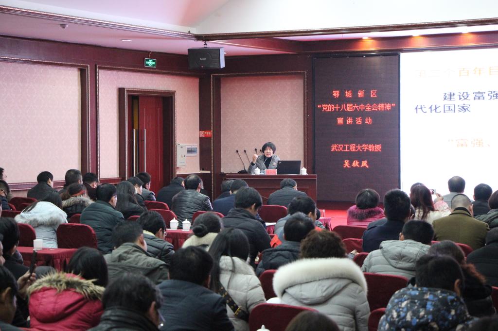 15日晚,吴秋凤教授应邀到鄂城新区作十八届六中全会精神宣讲报告,新区全体机关干部、各党(总)支部书记和副书记、各中小公司董事长及退休老干部均到场聆听报告会。吴秋凤教授的报告以《坚定不移推进全面从严治党——学习党的十八届六中全会精神》为题,从党的十八届六中全会召开的时代背景、突出的两大亮点和《准则》《条例》的内容解读三个方面,对全会精神进行了系统阐释和深刻解读。