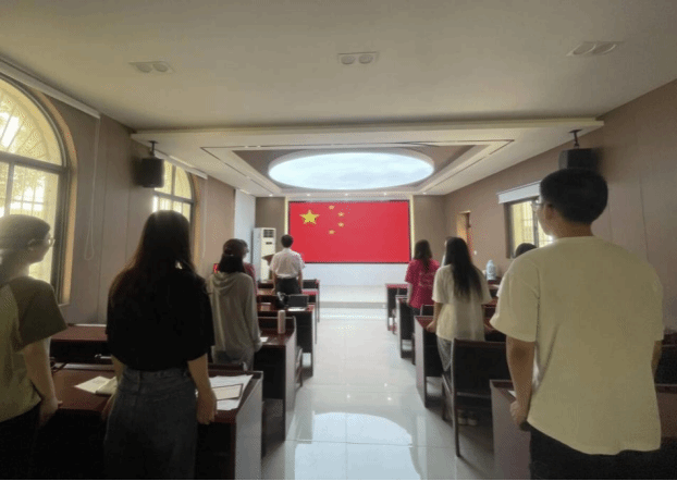 会议第一项,全体党员起立,齐声奏唱国歌。