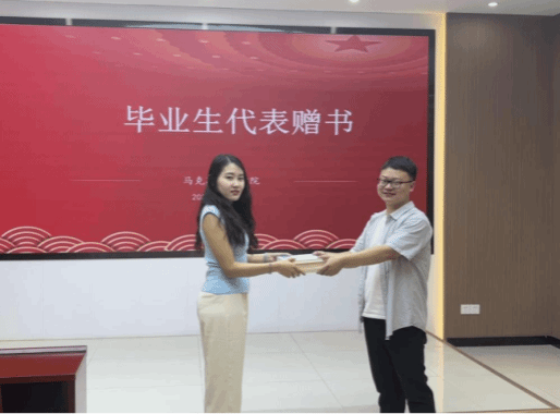 赠予一本启迪书籍,传递浓浓嘱托:毕业生党员筹集多本对学弟学妹们未来的学习和生活有所帮助的书籍,借本次活动机会赠予学弟学妹们。在赠书仪式上,毕业生代表丁薇向在校员工代表陈斌进行赠书,并向学弟学妹们送上自己最真挚的祝福。(审核:刘卫民 陈俊)