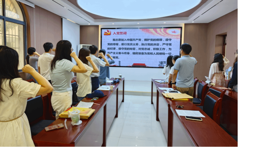 第一阶段,开展支部主题党日活动。活动伊始,全体起立,奏唱国歌,重温入党誓词。
