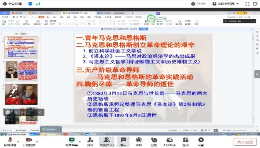 在课程开始时 谢俊老师带领同学们观看了恩格斯《在马克思墓前的讲话》的视频资料,以视觉冲击激发同学们的学习马克思主义著作的兴趣。