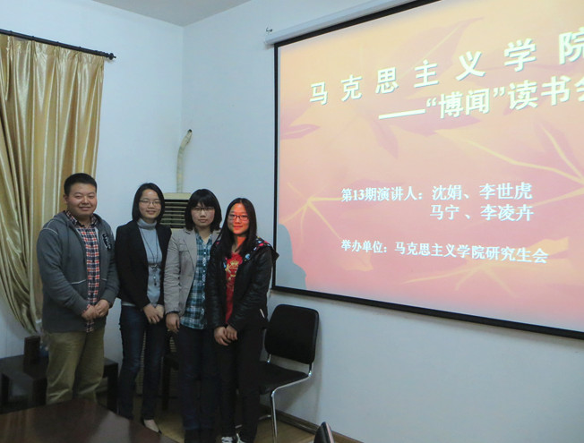 首先,沈娟同学以《学习贯彻党的十八大精神》为题,紧紧围绕我国当前社会的“新四化——工业化、信息化、城镇化、农业现代化”建设问题,做了简明扼要的报告,报告中有关建立“新型土地”制度的新颖观点,发人深省。