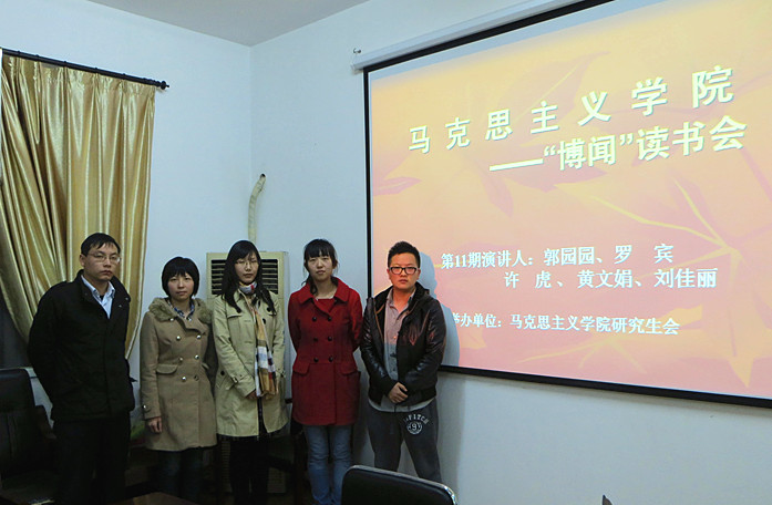 2012年3月20晚,第11期“博闻”读书会在流芳校区yl7703永利会议室顺利举行。本期“博闻”读书会由yl7703永利研究生会主席李嘉仪、学术部部长孙梓毓主持,并组织公司研究生积极参与。此次读书会主讲人分别是来自公司的罗宾、许虎、黄文娟、刘佳丽、郭园园同学,五位同学以“学习党的十八大精神”为主题进行了激情洋溢的演讲,赢得了在座同学阵阵掌声。