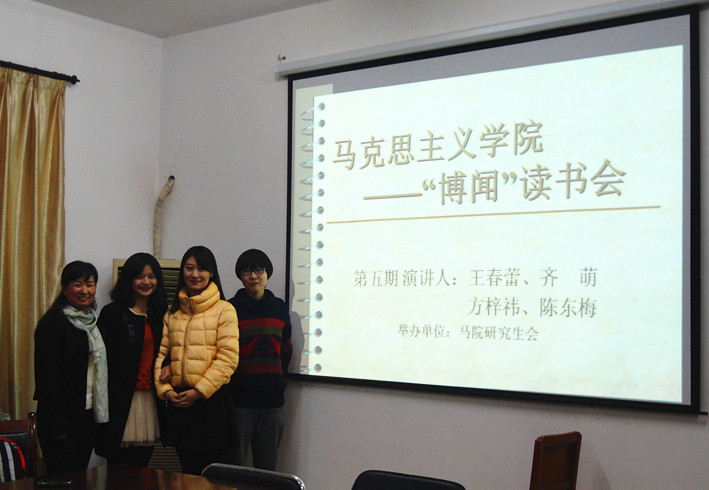 2012年11月21日晚,第7期“博闻”读书会在流芳校区yl7703永利会议室顺利举行。本期“博闻”读书会由yl7703永利研究生会主席李嘉仪、学术部部长孙梓毓主持,并组织公司研究生积极参与。此次读书会的主讲人分别是来自公司的王春蕾、齐萌、方梓祎、陈冬梅四位同学。四位同学以“中国共产党第十八次全国代表大会”为主题进行了丰富生动的报告,赢得了在座同学的认可与掌声。