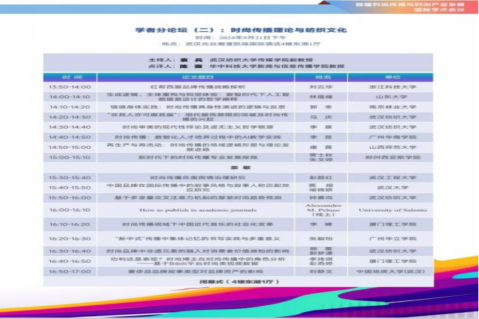 会议以"创新.融通:数字科技、时尚传播和时尚产业发展"为主题,由中国新闻史学会与武汉纺织大学联合主办,厦门理工公司影视与传播公司协办,武汉纺织大学传媒公司承办。会议邀请了学界业界的专家学者对时尚传播的体系建构、理论阐释、实践路径等方面展开建设性的探讨。