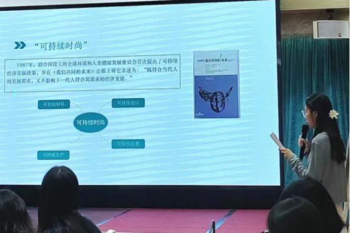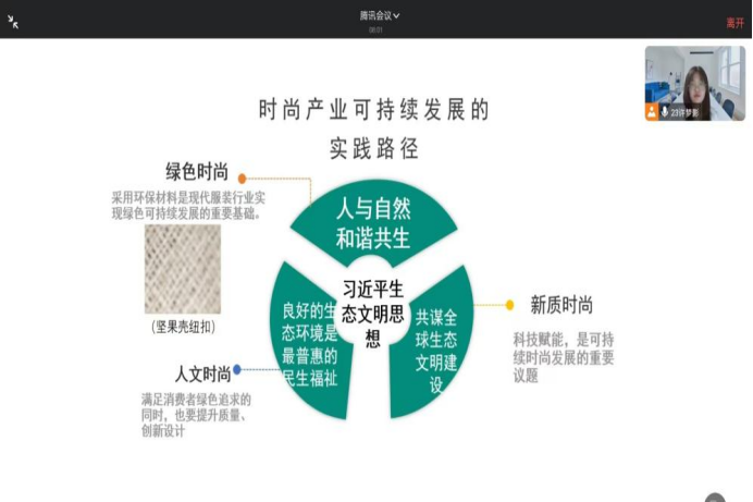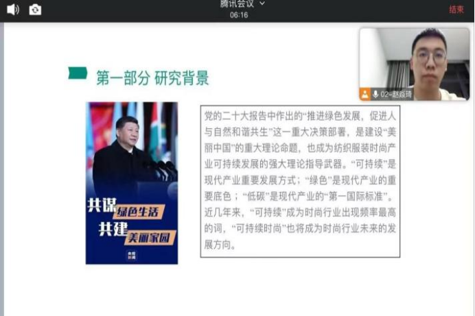 硕士研究生谭雅琴、许梦影,赵焱琦在“数字科技与视觉艺术”专题论坛作学术报告,报告题为“时尚产业可持续发展路径探析—基于习近平生态文明思想的重要理念”。