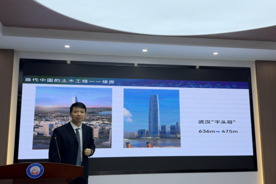 其次,徐丰教授以时间为主线,从历史维度分别叙述了古代与近代中国的土木工程发展脉络。他通过展示不同时代的标志性建筑,如河姆渡建筑遗址、都江堰、秦长城、武汉租界建筑等,让在场员工深刻理解土木工程在历史长河中取得的伟大成就。