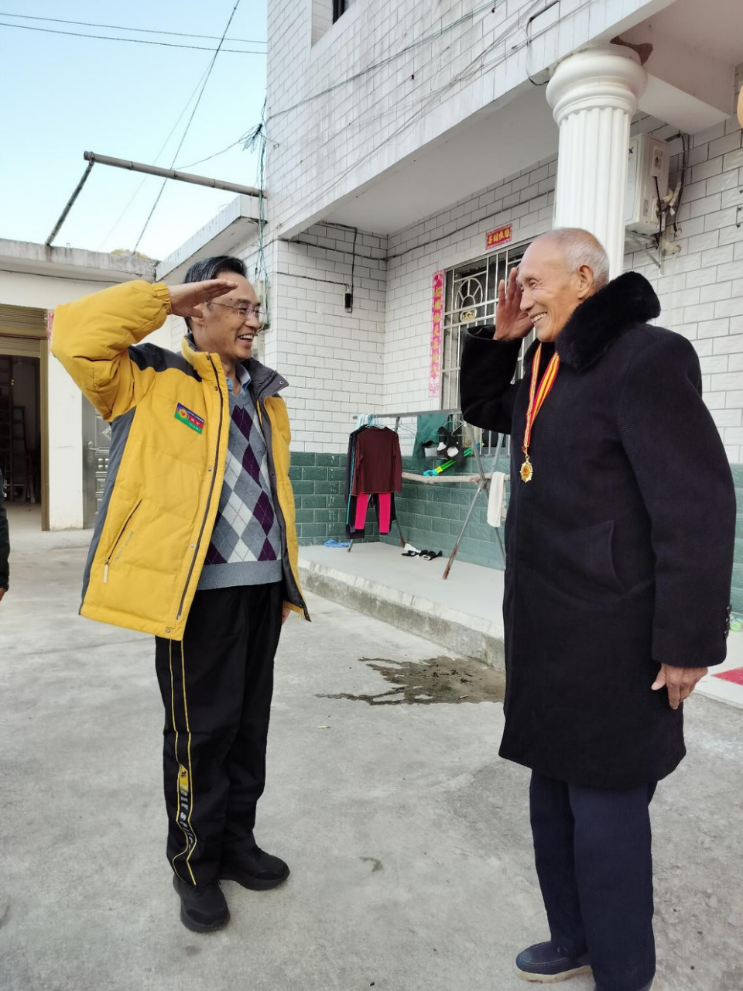 下午,慰问组一行人来到蕲春县刘河镇中路村,对因战致残的抗美援朝退伍老兵丁仁元进行慰问,老人坐在轮椅上向来看望的慰问人员表示感激。