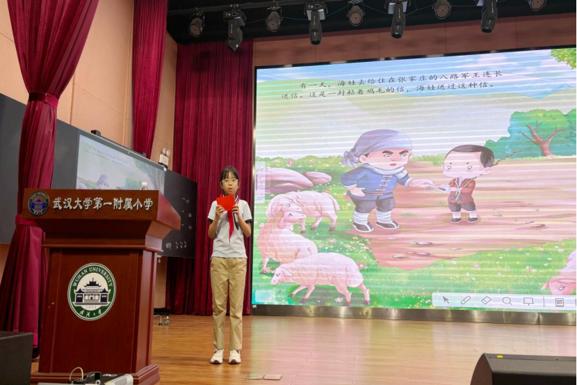 随后,武大一附小员工代表张爱文同学作为“第三代”宣讲人登台。她以稚嫩却坚定的声音,动情地向在场听众讲述了经典红色故事《鸡毛信》。故事中,主人公海娃在危难关头所展现的机敏与果敢,不仅深深渗透到她的日常学习生活中,更在她心中播下了红色精神的种子,成为支撑她成长的重要精神养分。