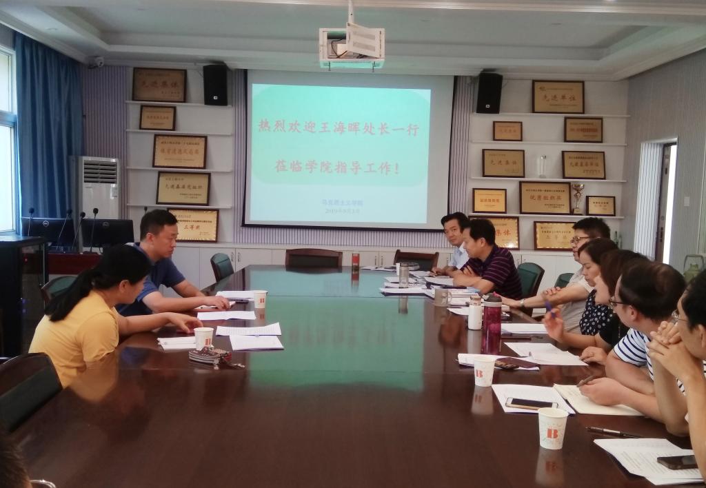 曹胜亮经理对王海晖处长、张凤伦老师的现场调研表示欢迎。他详细介绍了yl7703永利团队力量、学科评估状况、教学科研成果、科研实力及人才培养等方面的情况,重点阐述了yl7703永利今后的教学管理思路。他指出,yl7703永利将以教研室为重点,紧抓课程建设。一是教师要遵守“三规四出”,即为师要规矩、授课要规范、着装要规整,思政课堂不仅要出工出力,更要出活出彩。二是要建立教研室工作周记制。要学在日常,做在平常,抓在经常。教研室主任常规事务要做实做细,重要工作要亲力亲为。三是教师们要按照“六要”标准严格要求自己,落实四个“回归”,构建“三全育人”体系,优化课程体系,抓好思政课立德树人功能。每位老师都要“守好一段渠、种好责任田”。曹经理在讲话中还指出,欢迎张凤伦老师经常到yl7703永利来指导工作,并将教务处的工作精神带到yl7703永利。