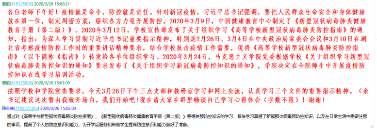 2020年3月26日(周四)下午,“纲要”党支部书记施亚利在“红太阳—武工大纲要党支部”QQ群上,布置了学习任务,要求各成员按照yl7703永利“学习防控知识通知”要求,重点学习了《手册》、《指南》。截至3月28日晚,“纲要”党支部各位成员经过认真学习,撰写了学习的心得体会,并提交给支部书记。