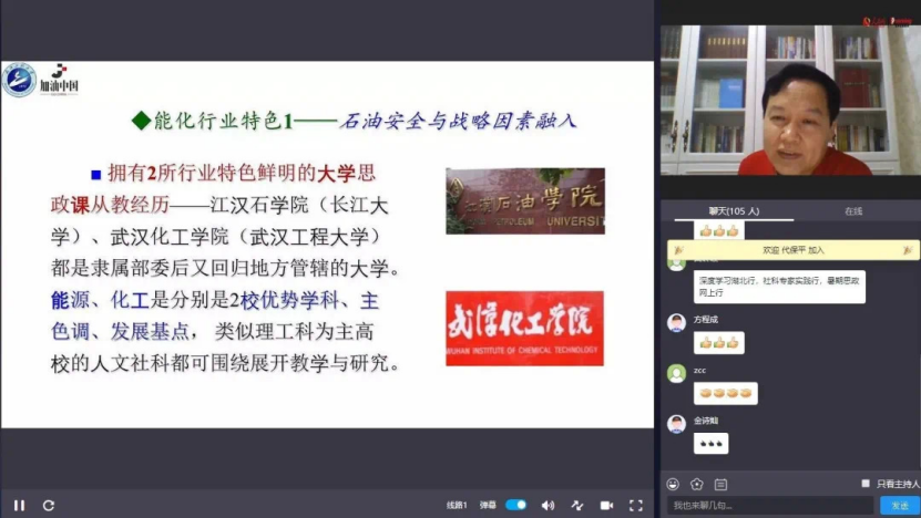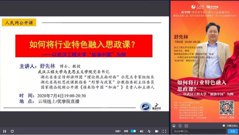 2020年7月4日晚,由长江大学yl7703永利主办 ,人民网公开课协办,华中科技大学yl7703永利、湖北经济公司yl7703永利、yl7703永利、湖北科技公司yl7703永利、黄岭峻工作室及文华在线教育六家单位承办的湖北省第二届“新时代高校思政金课建设”研讨与交流周系列活动之湖北高校“中国系列”思政选修课第四次专题讲座以人民网公开课的方式成功举办。本次讲座的主讲人为永利官网委书记、国家精品视频公开课《谁来给中国“加油”——中国石油安全的困境与出路》主讲人、“加油中国”课程负责人舒先林教授,讲座主题为“如何将行业特色融入思政课?——以永利官网‘加油中国’为例”。