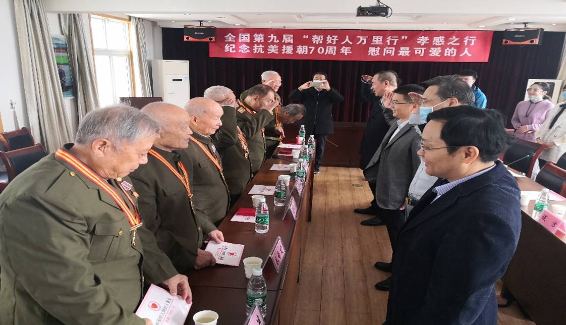 10月25日,正值重阳佳节和抗美援朝出国作战胜利70周年纪念日。在这个特殊的日子里,“帮好人万里行”湖北孝感之行代表团看望并慰问了祖国最可爱的人——9名曾参加抗美援朝战争的退役老兵:王清珍,李国增、夏登明、闫正腾、朱奇才、李天运、王玉生、钟生全、龚晓初。孝感市退役军人服务中心党支部副书记、副主任楚登峰说:“我们选择在抗美援朝70周年纪念日和重阳节这天来慰问参加过抗美援朝战争的老兵,实际上是彰显了党和政府以及社会各界对老兵的重视,对退役军人工作的重视。通过学习老兵的英雄事迹,使我们感受到我们和平环境的来之不易,所以我们活着的人们应该更加珍惜这种安宁的环境。”