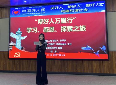 如何正确理解帮好人要行万里路,谈教授现场分享了他帮助好人的经历。他去到重庆寻找见义勇为者卢文学;去开封慰问抗战老兵,并且同时挖掘出老八路的好儿媳马雪琴;资助黄石见义勇为者柯梅花……针对每一张图片,谈教授都如数家珍,细心分享图片背后的故事,让人身临其境。谈教授指出行万里路帮好人,能更真实的感受好人好事。具体的实地考察,可以更大程度上避免或者减少失误,更能精准帮扶,真正可以帮助到更多需要帮助的人;更有利于坚持好人大团结大联合,共建道德建设共同体,推动多方联手帮好人,形成更好的社会氛围和社会风尚;更有利于理论联系实际,探索具有中国特色的好人事业和好人文化,公益慈善和志愿服务。