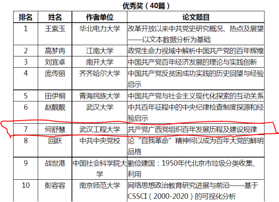 (通讯员蔡明广)近日,公司2020级硕士研究生何舒慧(导师为何景春教授)撰写的论文《共产党广西党组织百年发展历程及建设规律》在西安交通大学2021年全国研究生学术论坛获得优秀奖。据悉,本次论坛共收到包括中共中央党校、清华大学、武汉大学、南京大学、中国人民大学、南开大学、吉林大学、兰州大学、华南师范大学、陕西师范大学、西南大学在内208所高校(81个单位具有马克思主义理论学科博士点)研究生提交的论文803篇。经主办方组织专家评审,共评选出获奖论文100篇,其中一等奖10篇,二等奖20篇,三等奖30篇,优秀奖40篇。何舒慧同学提交的论文获得优秀奖,进入前100名。