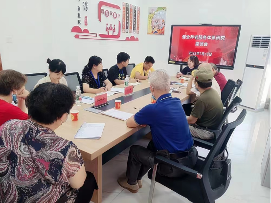 7月13日,实践队前往古楼街道下辖社区调研。实践队在考棚社区参观了馨悦养老服务中心,向老人发放问卷调查并进行实地访谈。考棚社区余晴副书记、社区委员段园、周丽分别向调研组介绍了考棚社区在社区治理、关爱老人开展的特色工作以及数字化养老中遇到的难题,馨悦养老工作人员分享了该养老机构“公益+商业运营”的养老服务模式。在四眼井社区座谈中,实践队聆听了老人对养老服务与设施改善的意见要求以及数字化背景下老人的现实难题。