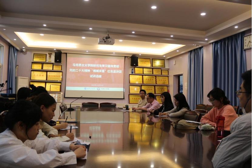 (通讯员:梁若 男曹松)为充分发挥马克思主义理论学科优势,让青年学子主动走出去学习宣传贯彻党的二十大精神,11月11日下午,公司在207会议室举办研究生学习宣传贯彻党的二十大精神“博闻求是”红色宣讲团试讲选拔活动。公司党委副书记、副经理(兼)陈俊,理论宣讲中心主任王威,公司团委书记蔡明广作为评委参加活动。