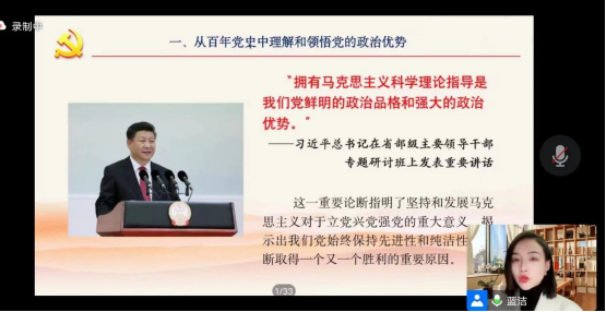 首先,兰洁博士分享了中国1921-2021百年沧桑历史巨变的相关视频,根据党的二十大报告中对中国式现代化的讲述,引出课程的第一个主题——从百年党史中理解和领悟党的政治优势。兰洁博士从救国大业、兴国大业、富国大业和强国大业四个角度出发,引用党史人物及重要会议的相关讲话,讲解了中国共产党带领人民完成新民主主义革命,建立中华人民共和国;确立社会主义基本制度,推进社会主义建设;进行改革开放伟大革命,极大解放发展生产力;夺取新时代中国特色社会主义伟大胜利的一系列卓越成绩。