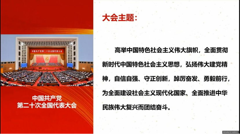 (通讯员:沈洁(22级)丁薇)2月10日下午2:30,2023年寒期“精讲精学精练”第四讲在腾讯会议顺利举行。本次学术活动的主题以“不忘初心再出发 砥砺奋进新征程——深入学习贯彻党的二十大精神”而展开,由李齐老师主持,曹胜亮经理担任主讲,公司全体研究生参加。