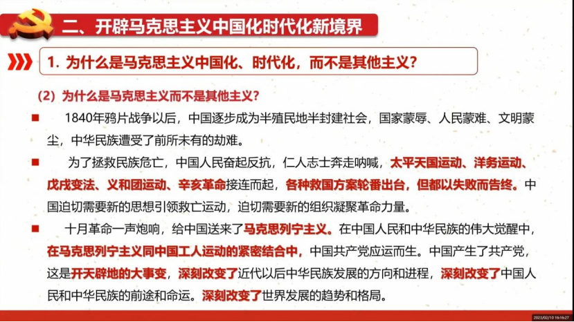 在解读党的二十大报告精神时,曹经理围绕“以中国式现代化全面推进中华民族伟大复兴”为主线,为同学们讲解了党的二十大精神的本质内涵和知识框架,简明扼要地阐述了其核心要义,描述了党的十八大以来新时代十多年的伟大变革,重点论述了开辟马克思主义中国化时代新境界的内在逻辑,包括为什么是马克思主义中国化、时代化,而不是其他主义?为什么要开辟马克思主义中国化、时代化新境界?怎样开辟新境界?如何评价新境界?新境界在实践中如何表达等五个方面。