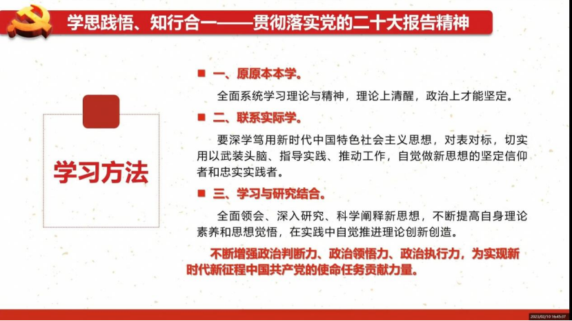 最后,曹经理鼓励研究生们在全面贯彻落实党的二十大报告精神的过程中,要做到学思践悟、知行合一,向同学们提出了深入学习“五个牢牢把握”、“七个讲清楚”的学习要求,并激励员工要将学习和研究结合,不断增强政治判断力、政治领悟力、政治执行力,为实现新时代新征程中国共产党的使命任务贡献力量。