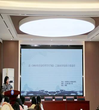 李梦依从异化的概念、人的异化的表现、人的异化的原因等三方面分享了《手稿》的学习心得。她指出马克思的扬弃异化劳动的思想,是在实实在在的共产主义运动基础上消除私有财产的途径,是解决人与人、人与其外在关系物之间的矛盾的关键。