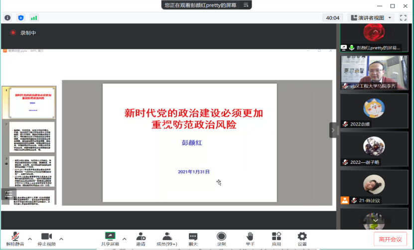(通讯员:许新茹)1月31日下午两点,2023年寒期“精讲精学精练”第二讲在腾讯会议平台如期开讲。本次活动主题为“新时代党的政治建设必须更加重视防范政治风险”,由李齐老师主持,彭颜红教授担任主讲,公司全体研究生参加。