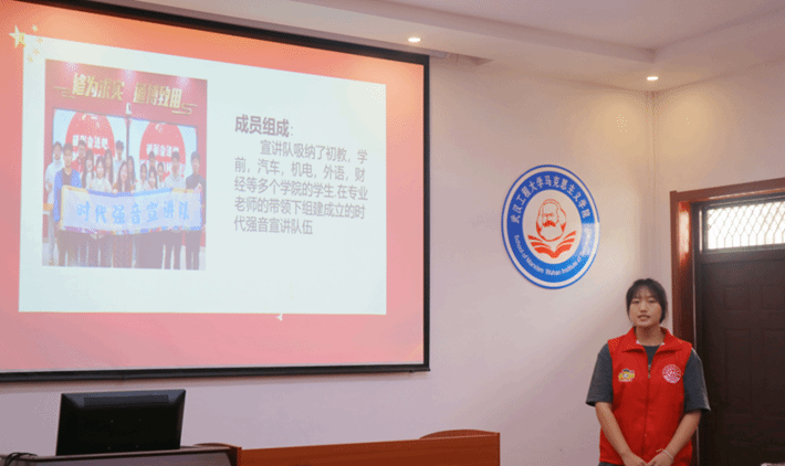 武汉城市职业公司时代强音宣讲队成员代表从团队发展历程、所获成就、反思和规划等四个方面展开介绍时代强音宣讲队的基本情况,并通过宣传片回顾了团队一年来的宣讲经历与收获。
