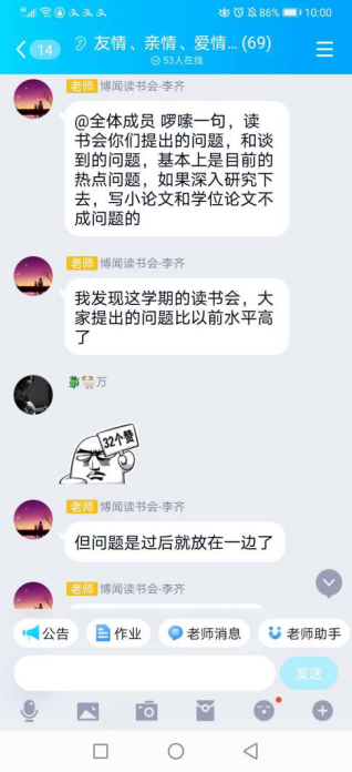 最后,李齐老师进行总结,他一方面对五位研究生同学的发言内容表示肯定,认为这五位同学认真准备、细致阅读著作,从不同视角对中国政治文化认同问题作出了独特的阐释;另一方面李齐老师提到,我国各民族要像石榴籽一样紧紧抱在一起,才能够构建起坚实的中国特色社会主义发展道路,并以共同团结奋斗、共同繁荣发展的精神,实现中华民族伟大复兴。