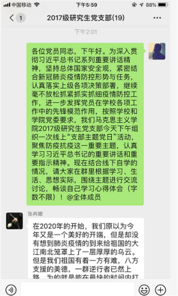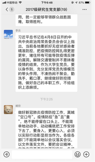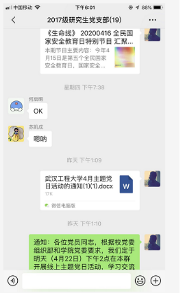 (通讯员万浩天)2020年4月22日下午,2017级研究生党支部利用微信群组织开展线上支部主题党日活动。会议由员工党支部书记万浩天主持。