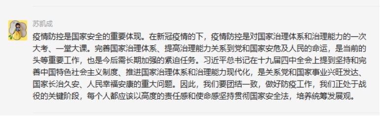 2017级研究生党支部预备党员王慧同志:通过这次突发疫情事件,我充分体会到了社会主义制度的优越性,集中力量办大事,若是没有国家兜底,多少普通家庭将面临崩溃,在经济和百姓性命的选择上,我们国家毫不犹豫选择是的是百姓。我们党在内忧外患中诞生,在磨难挫折中成长,在攻坚克难中壮大。敢于斗争、敢于胜利,是中国共产党人鲜明的政治品格,也是我们的政治优势。