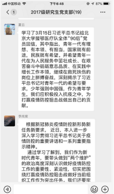 此次活动聚焦防疫抗疫这一重要主题,认真学习贯彻了习近平总书记在湖北省考察新冠肺炎疫情防控工作时的讲话精神、习近平总书记在4月8日召开的中共中央政治局常务委员会会议上的讲话精神、习近平总书记给北京大学援鄂医疗队全体“90后”党员回信精神。支部全体党员同志结合线下自学情况,在线上交流了各自的学习感悟和收获。