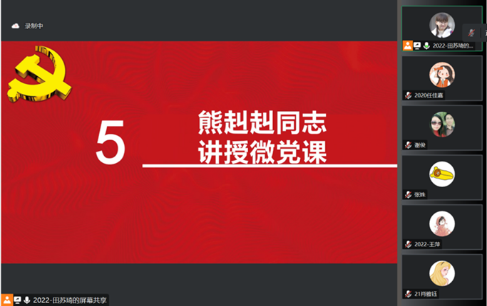 第五项,由支部党员熊赳赳同志讲授微党课。她围绕党的青年工作,以习近平总书记一系列关于青年工作重要讲话与青年寄语为重点,就“什么是青年、为什么抓青年工作”展开讲解。她认为,广大青年应听党话、跟党走,努力成长为堪当民族复兴大任的时代新人。