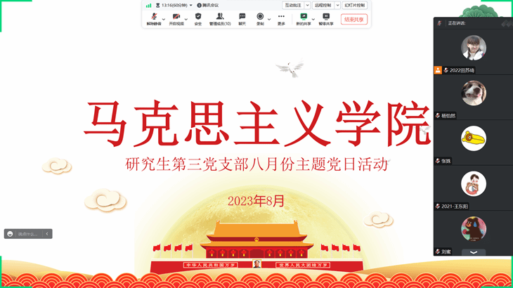 (通讯员 王萍 田苏琦)2023年8月29日晚上19:30,yl7703永利研究生第三党支部通过腾讯会议开展了八月份的主题党日活动。会议由党支部副书记田苏琦主持,研究生第三党支部全体员工党员参加。